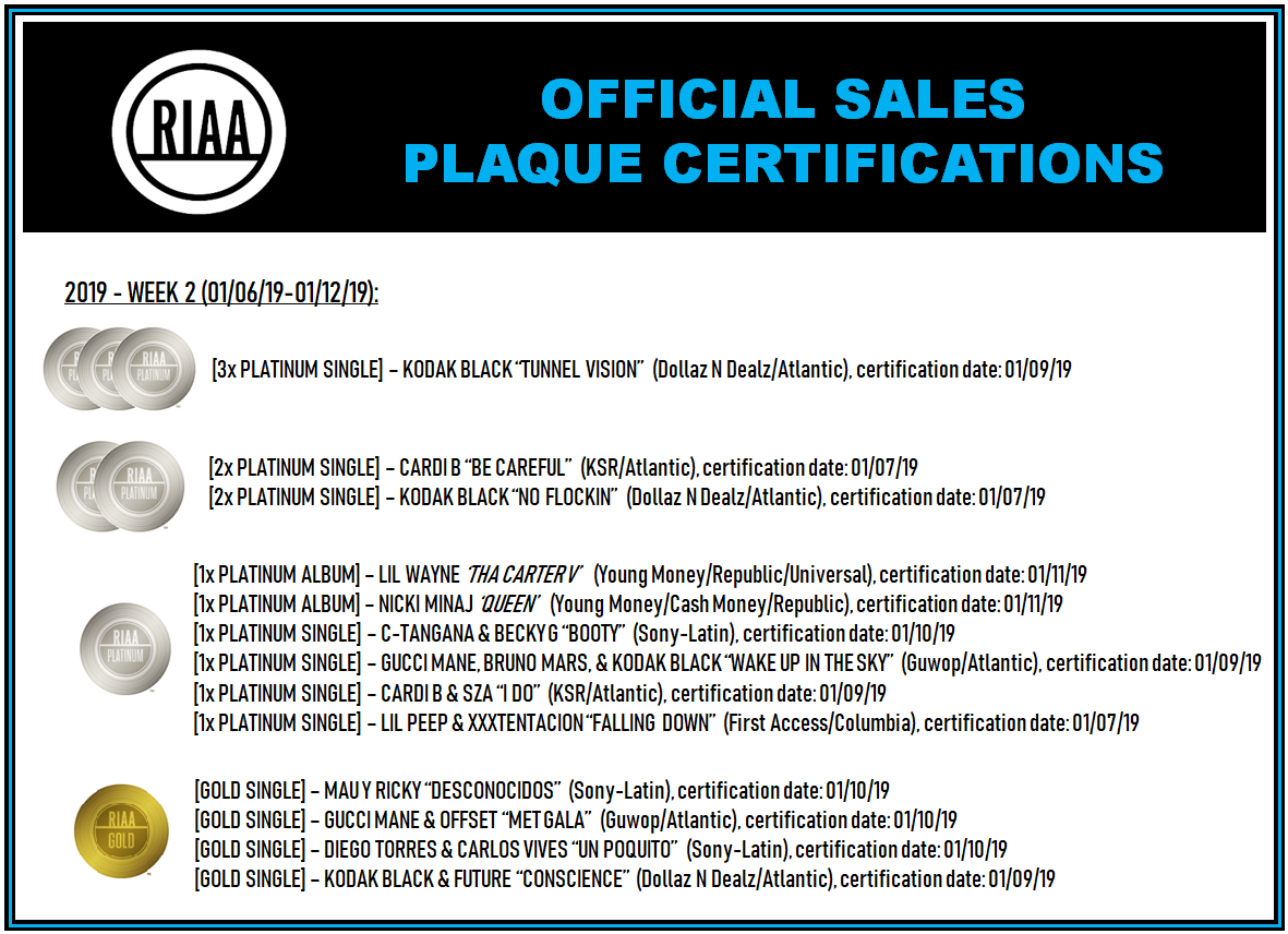 With my fresh new position as liaison between Mediabase & RIAA, it's my privilege to blast out the weekly music sales success report hot off the presses here @ RIAA. This is where I'll weekly be acknowledging all artists who have earned a certified sales plaque for both singles & albums. For Week 2 of 2019, my personal congrats goes out to: C. Tangana, Becky G, Bruno Mars, Cardi B, Carlos Vives, Diego Torres, Future, Gucci Mane, Kodak Black, Lil Peep, Lil Wayne, Mau Y Ricky, Nicki Minaj, SZA, & XXXTentacion - and all of their respective record labels. Keep the hits coming!